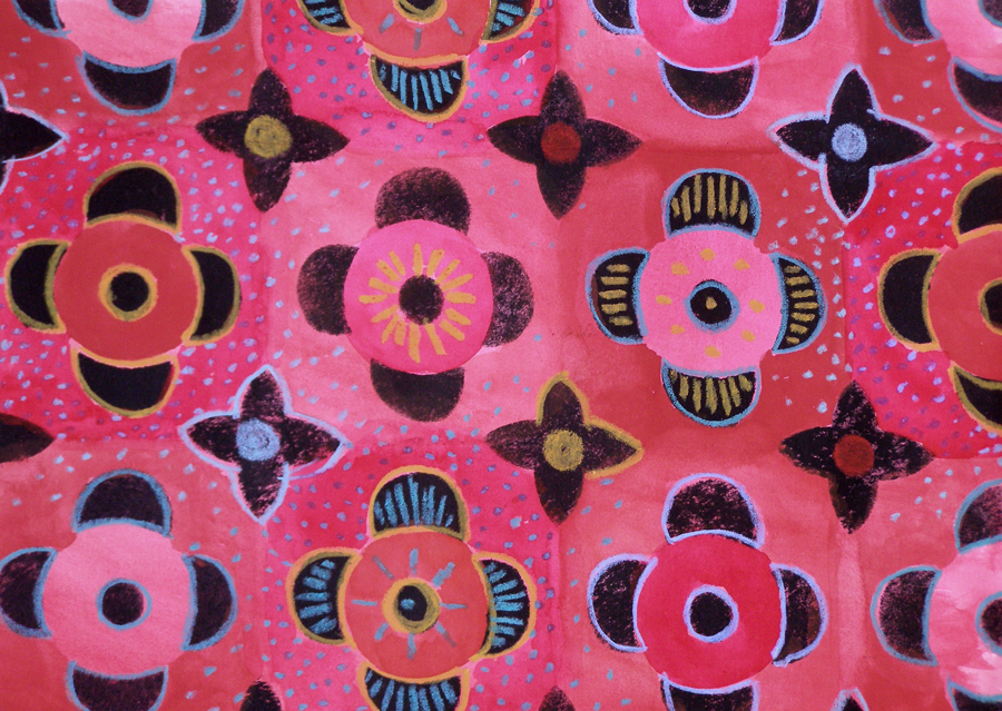 I have patterns all over my studio and in my computer … other people’s patterns along with my own, my own partly resolved patterns, and scraps I’m saving to make patterns. A fascinating thing about repeat patterns is that they have really evolved because of mass production.